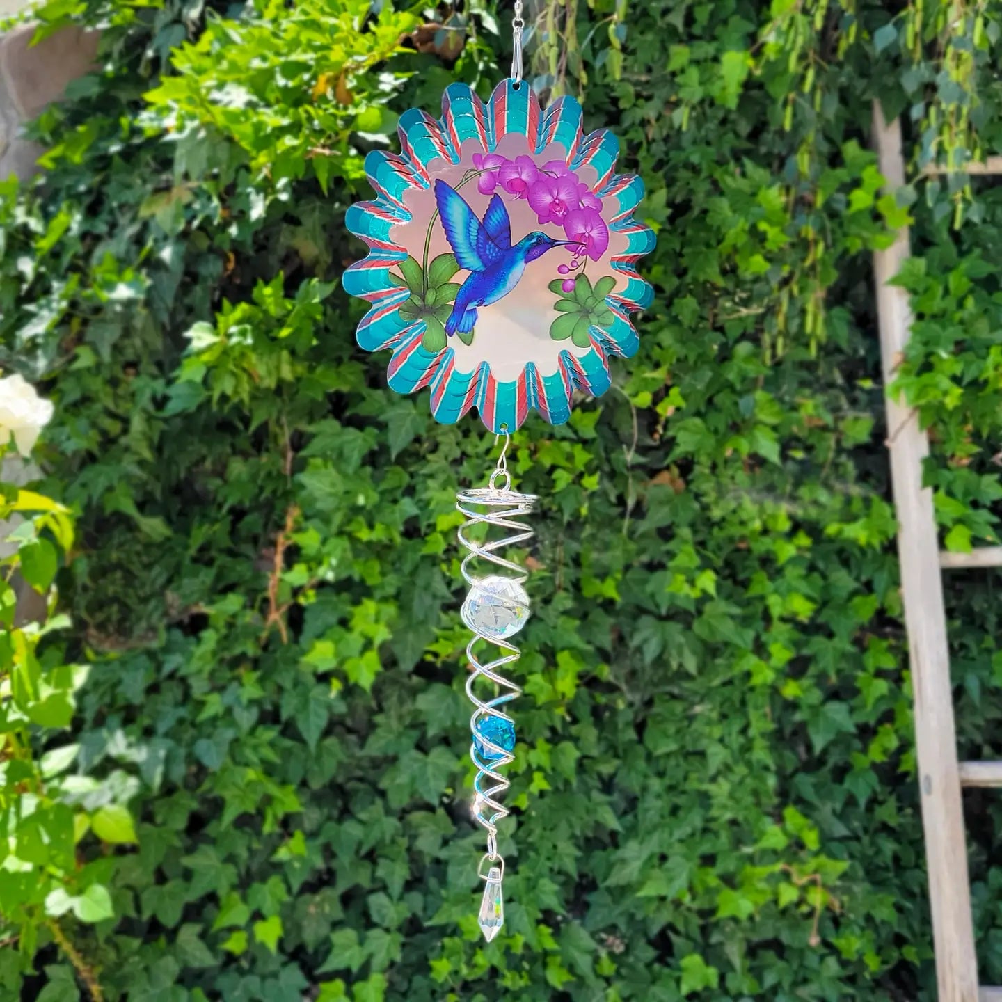Our Wind Spinners catch the eye and capture the imagination. These beautiful yard décor feature a bold color scheme, with a beautiful etched animated graphic in the center. It's made of durable stainless steel to hold up to the weather. Hang the Wind Spinner in your garden or on your porch for brilliant color in motion.