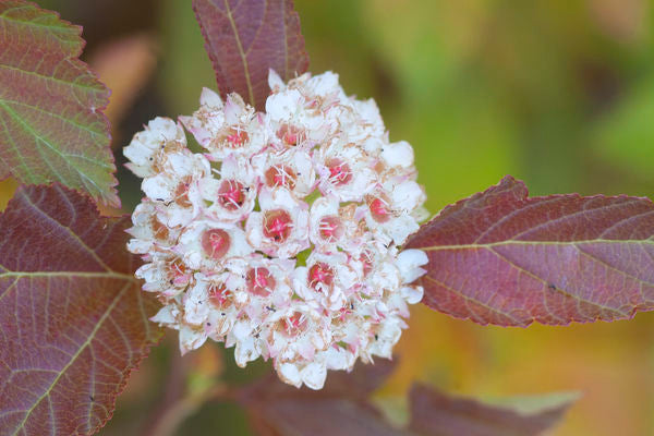 Amber Jubilee™ was selected for its striking new foliage in glowing tones of orange, yellow and gold. Rounded and dense in habit, this shrub with its bold array of colors makes an eye-catching hedge. Delicate white blooms are produced in spring. Summer foliage is green. Can be stage pruned in production through July to force colorful new growth. Fall foliage is highlighted with tones of red and purple, making this mildew resistant ninebark appealing over the entire season. Plant in full sun for best performance. Result of a controlled cross between 'Darts Gold' and Diablo® ninebark. Selected at Jeffries Nursery in Manitoba, Canada. (CPBR #4765, ®CA)