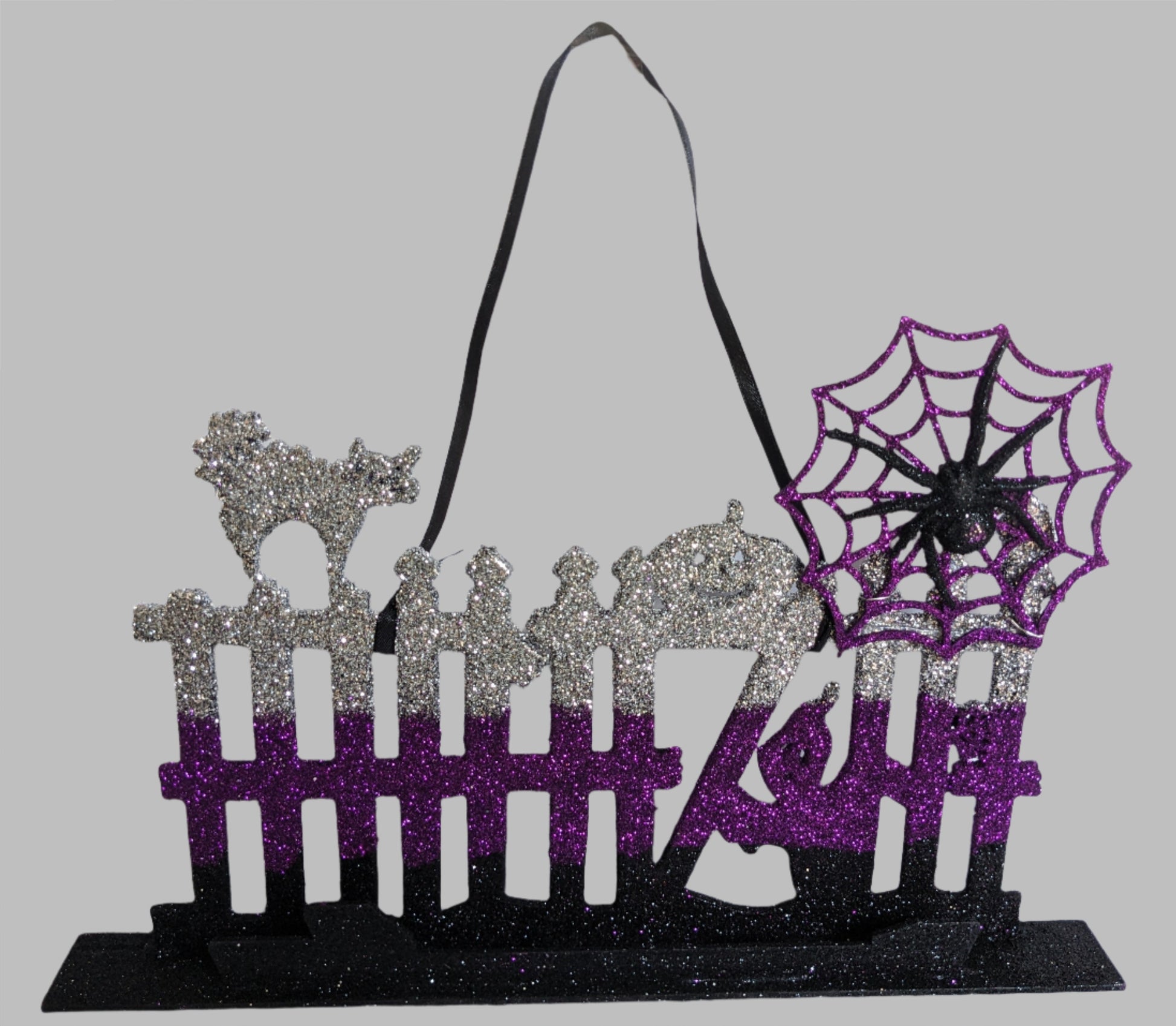 A glittery Halloween fence. Measures 10" long and 7.5" tall. Comes with a hanging ribbon.