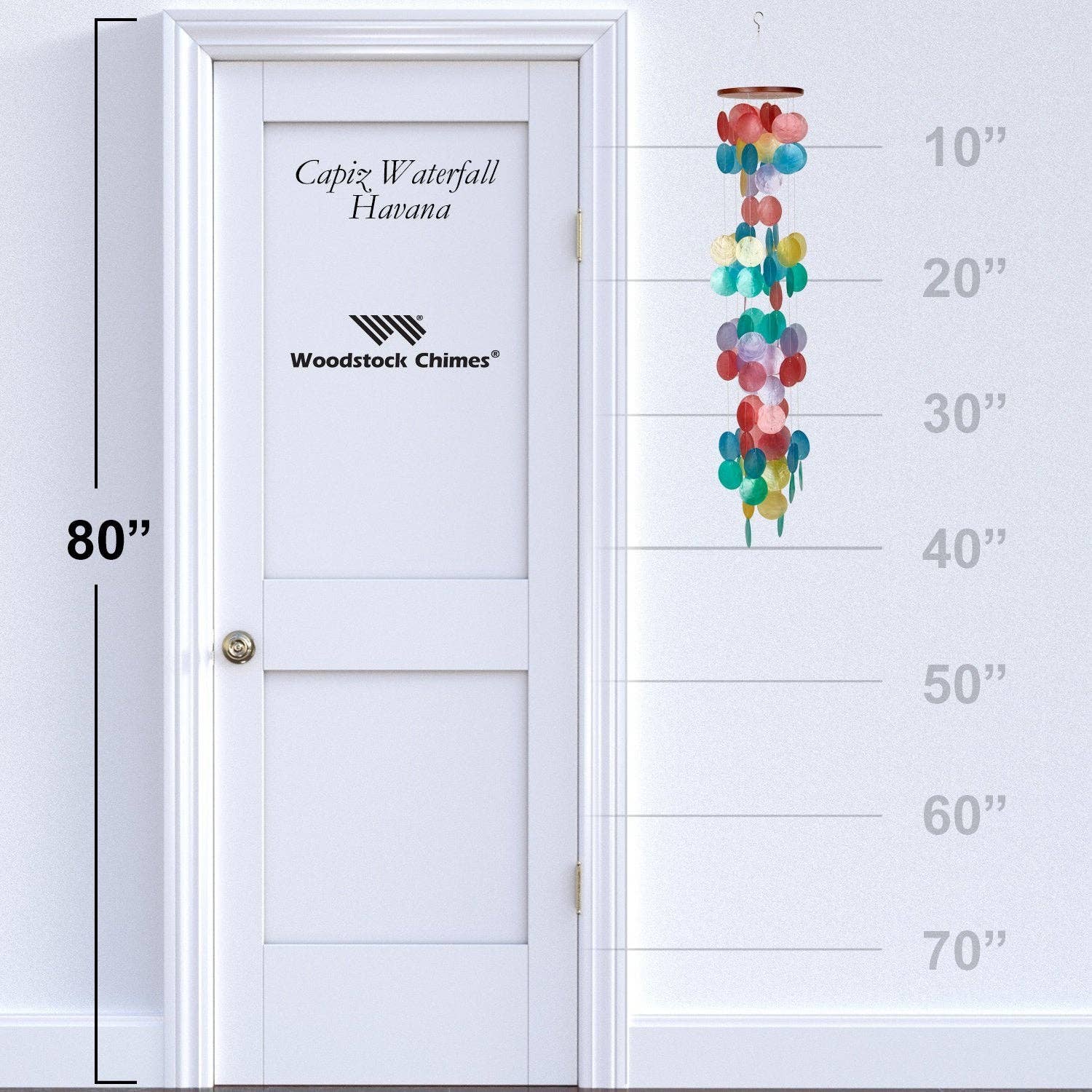 This dramatic cascade features the bright colors of Cuba. Capiz are farmed in Indonesia and every bit is used. The pieces are carefully sorted, dried, sliced, shaped, sanded, and dyed. The thin, flat translucent pieces of capiz provide a luminous color. In the 1500s, capiz was used as windowpanes in houses; now they are used in all sorts of home decorations, including lampshades, vases, and (of course) windchimes! This product is handcrafted with pride by artisans in Bali, therefore sizes can vary.