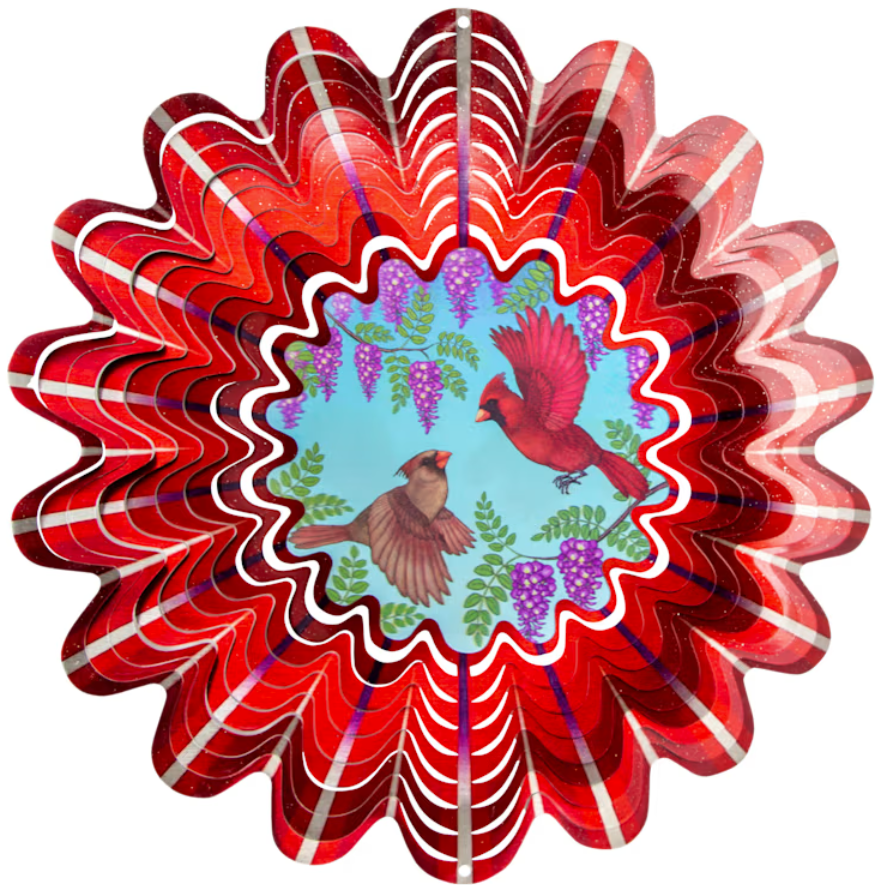 14" Animated Cardinals Mini Set. 6.5" Wind Spinner with a 7.5" Crystal Twister. Made from powder coated stainless steel. Durable and Weatherproof.