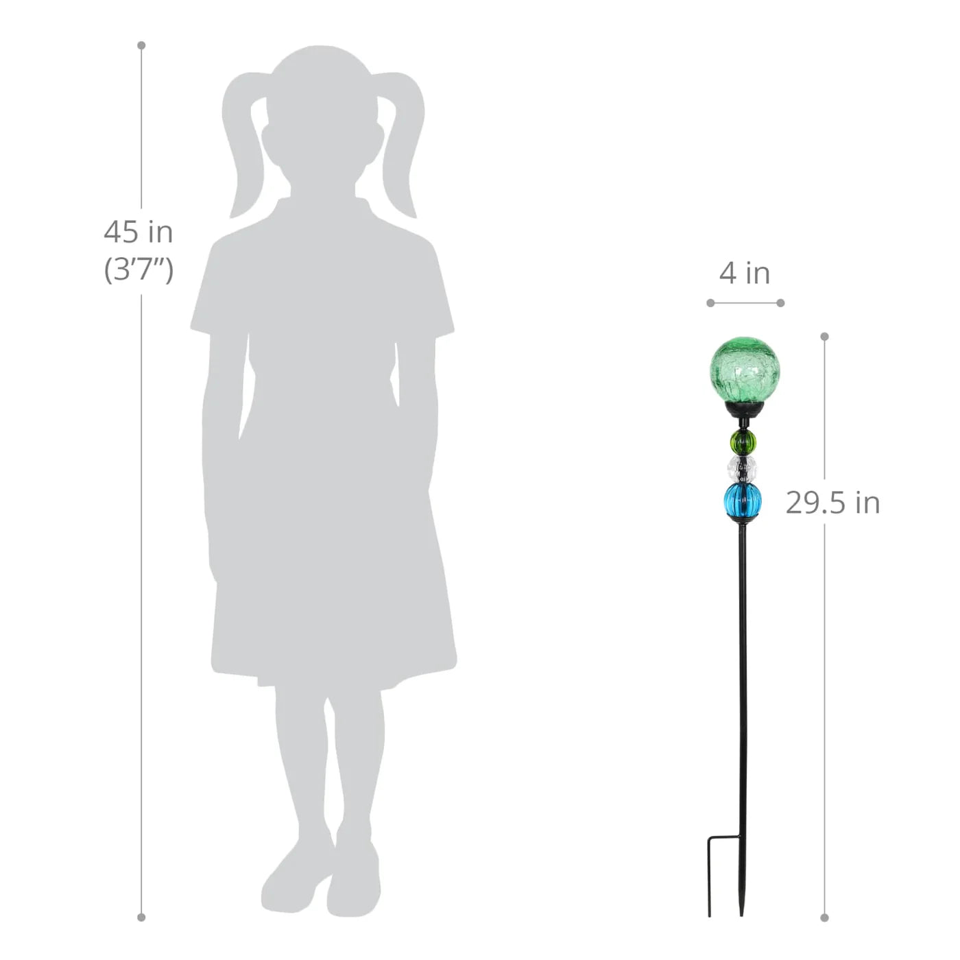 Illuminating Solar Green Crackle Glass Ball Stake adds a decorative touch to your garden day and night. As the sun sets and dusk settles in, your beautiful glass stake glows from within. The colorful beaded details add an extra touch of elegance. Makes a thoughtful gift and a wonderful addition to any landscape.