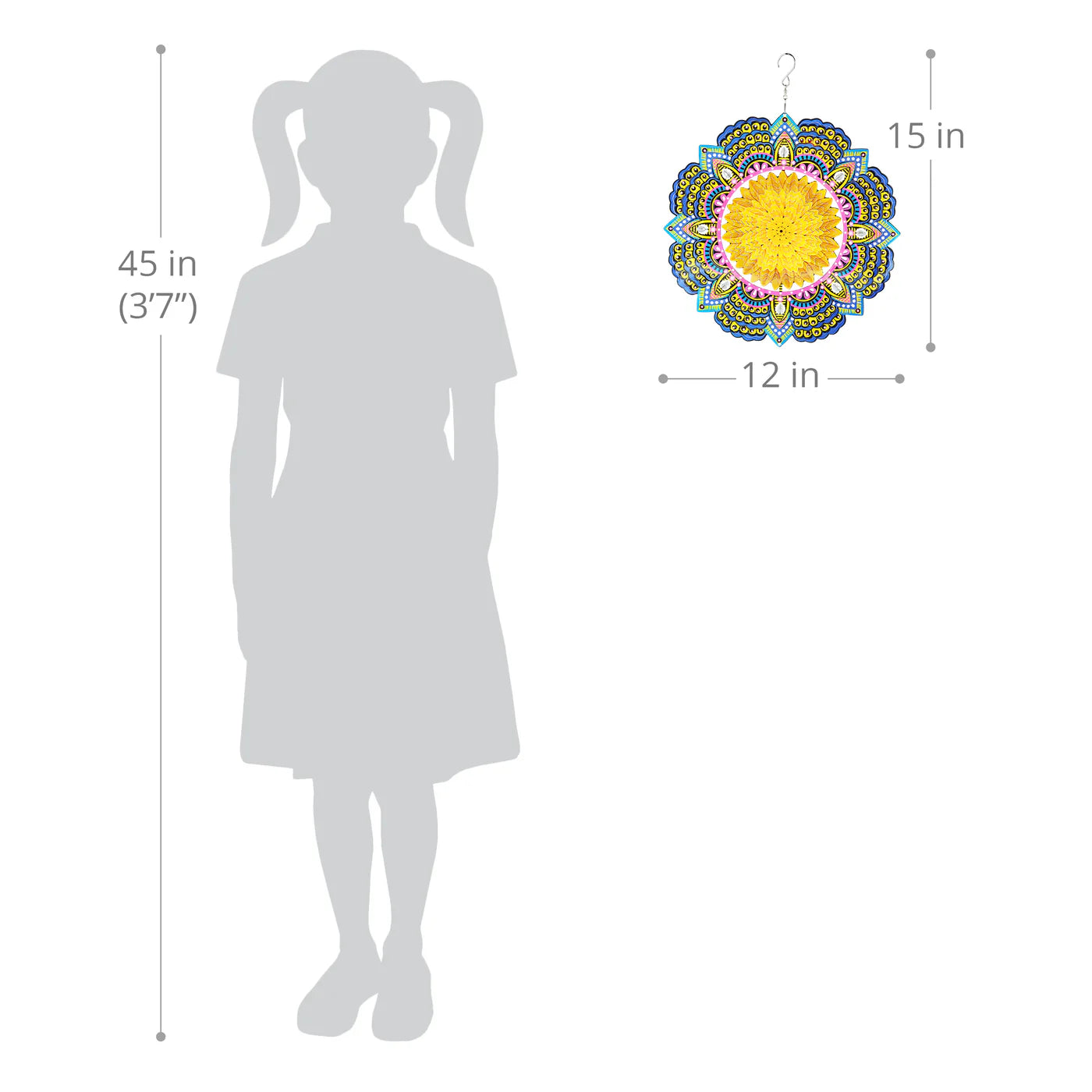 A 3D burst of colors come alive with this beautiful gold and blue spinning laser cut hanging garden spinner! Easily fans out to display intricate details and beaded accents that shine in the light. This ready-to-hang garden art makes a wonderful addition to your home and a treasured gift for your loved one.