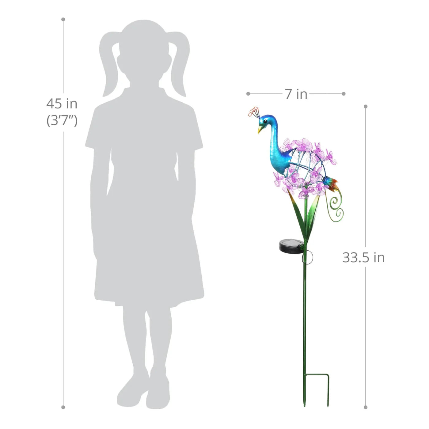 Purple solar flowers spin and illuminate from within on this beautifully hand painted Peacock Garden Stake. This charming work of art is hand painted and exquisitely designed to add a touch of color and elegance to your garden. Makes a fabulous gift that will illuminate at dusk for hours of glowing enjoyment!