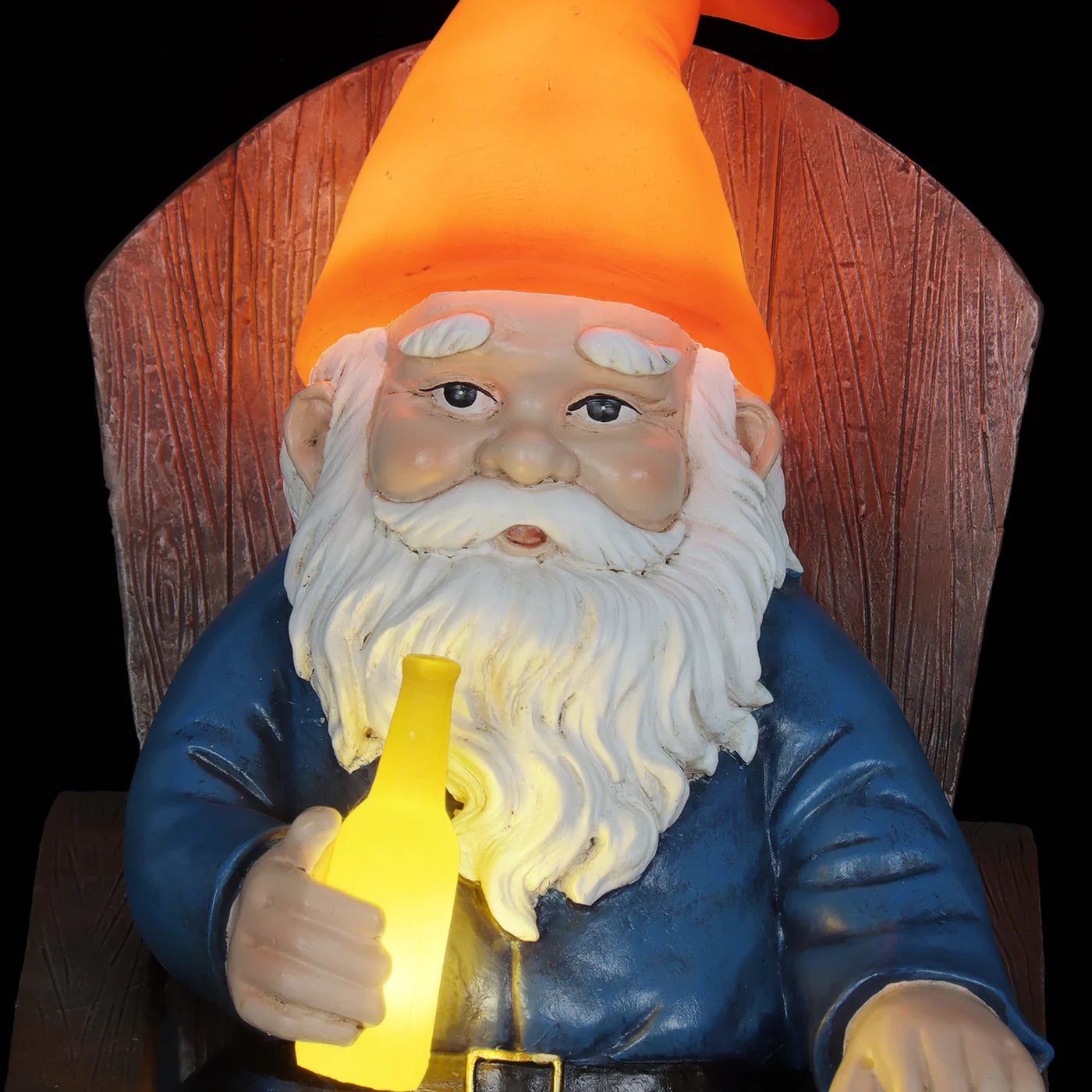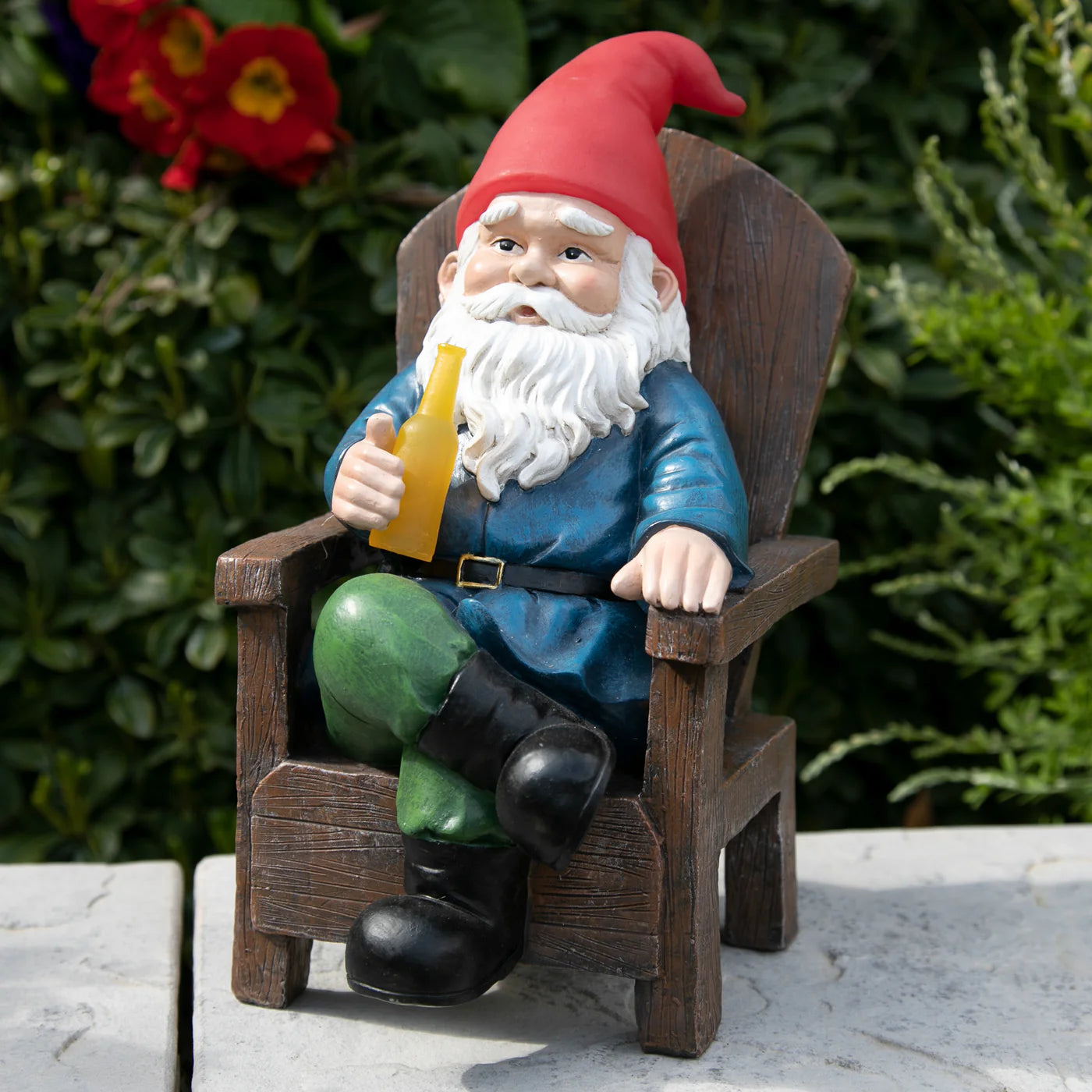 Life can be hard. Kick back with drinking Danny, the solar powered Good Time Gnome in his favorite Adirondack chair, and remember not to take it too seriously! Watch as the LEDs in his gnome hat and bottled beverage automatically illuminate with light, so you can enjoy this fun statue day or night! The solar powered LED lights will charge during the day for your convenience. Makes a great reminder to take a load off once in a while, you deserve it. Danny the gnome adds a little whimsy and a touch of good natured fun to your garden!
