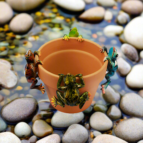 3.5" multicolor frogs designed to hang on pots or small planter boxes and add personality to your potted plants. Listing is for one pothanger.