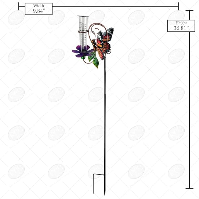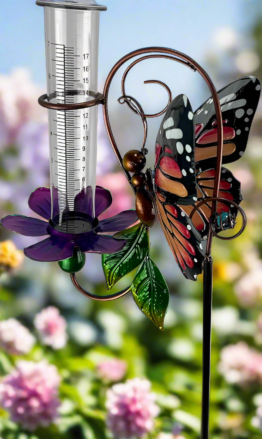 Monarch butterfly rain gauge garden stake. Features glass tube. H bottom stake. Metal, Glass. An ideal gift for family and friends for weddings, housewarmings, new homeowners and more.