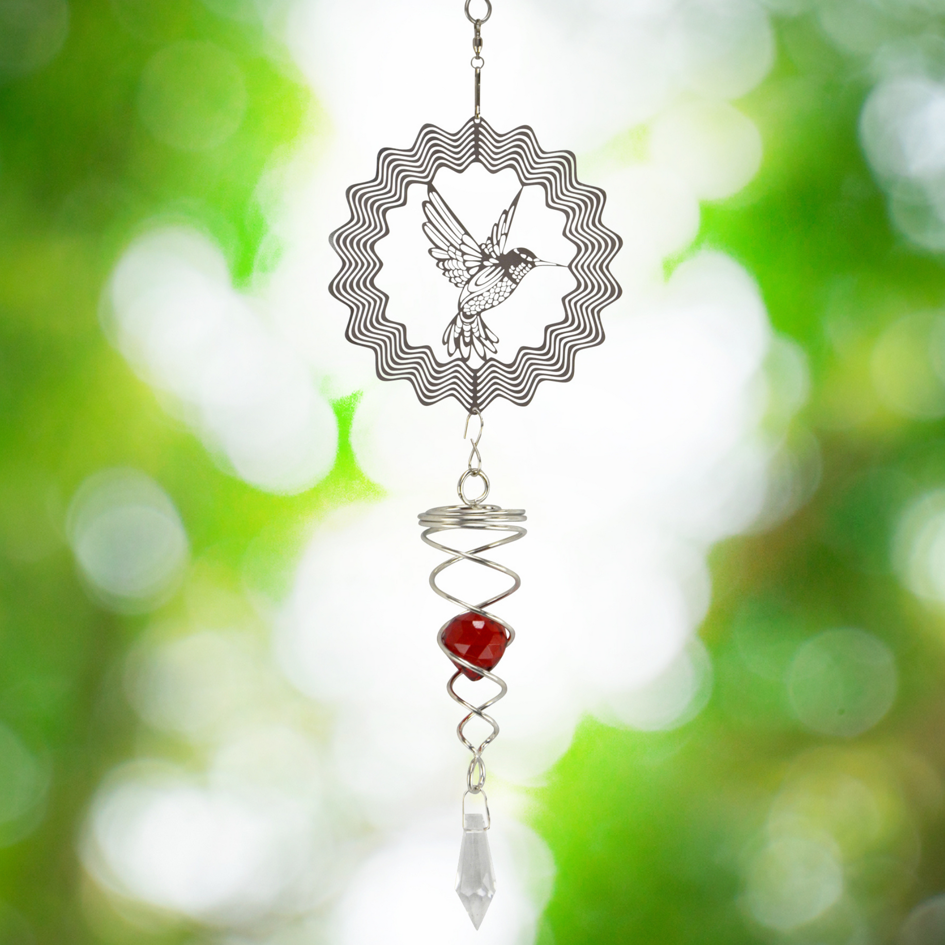 Add movement and charm to any outdoor space with our Hummingbird Suncatcher Spinner. This spinner features a stainless-steel hummingbird cutout and 2 crystal pendants – one red and one clear. The geometric edges fan out for a dynamic 3D effect as this piece spins in the breeze!