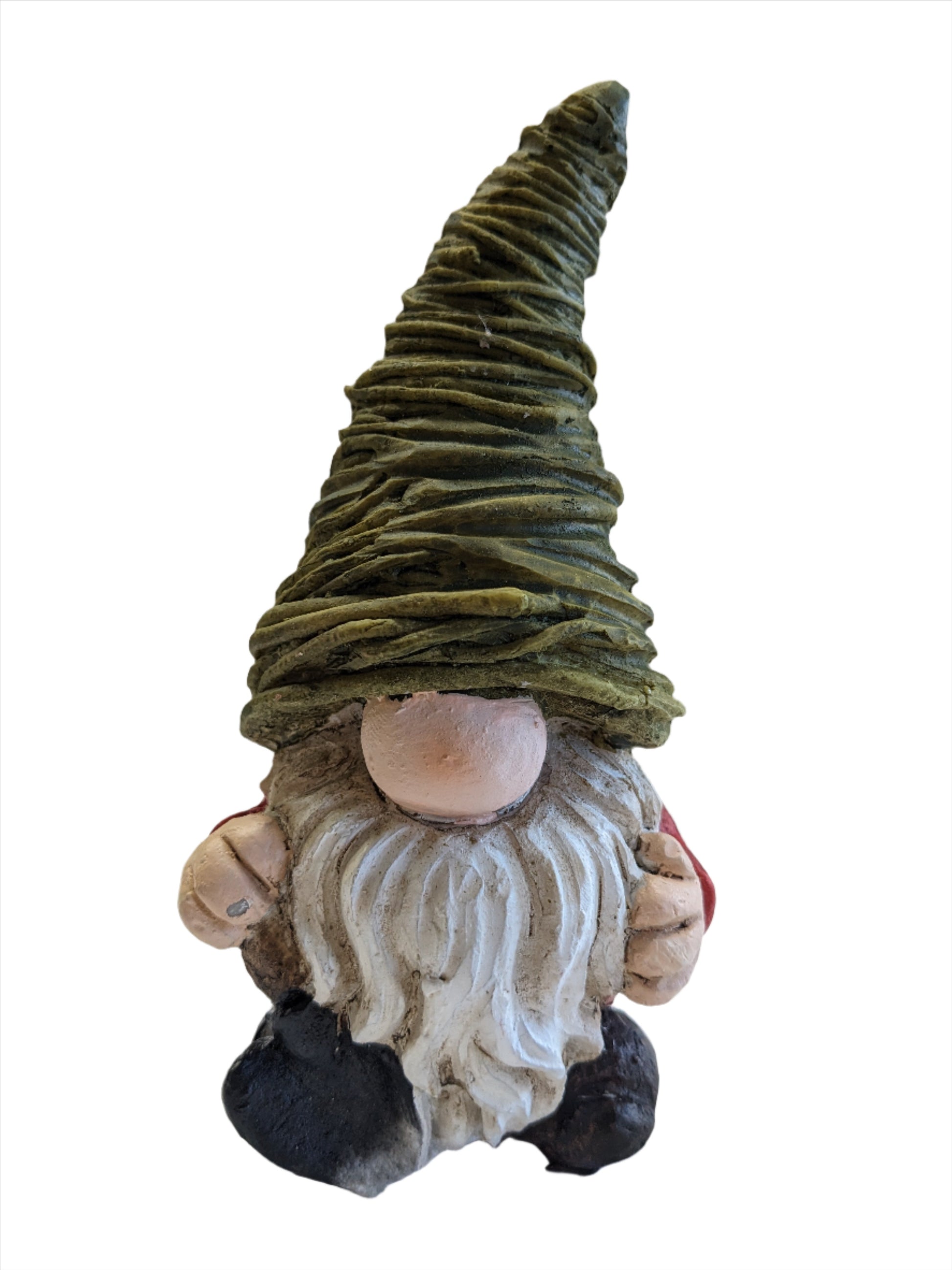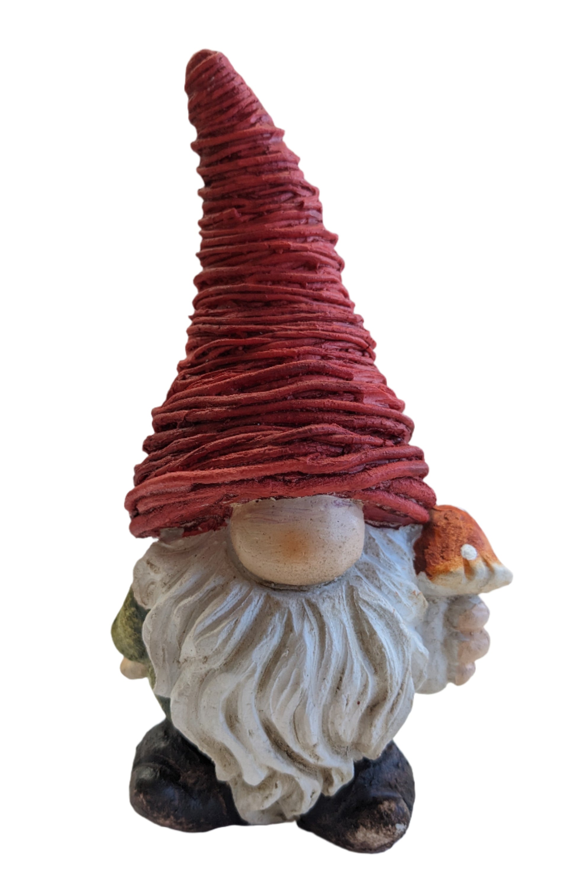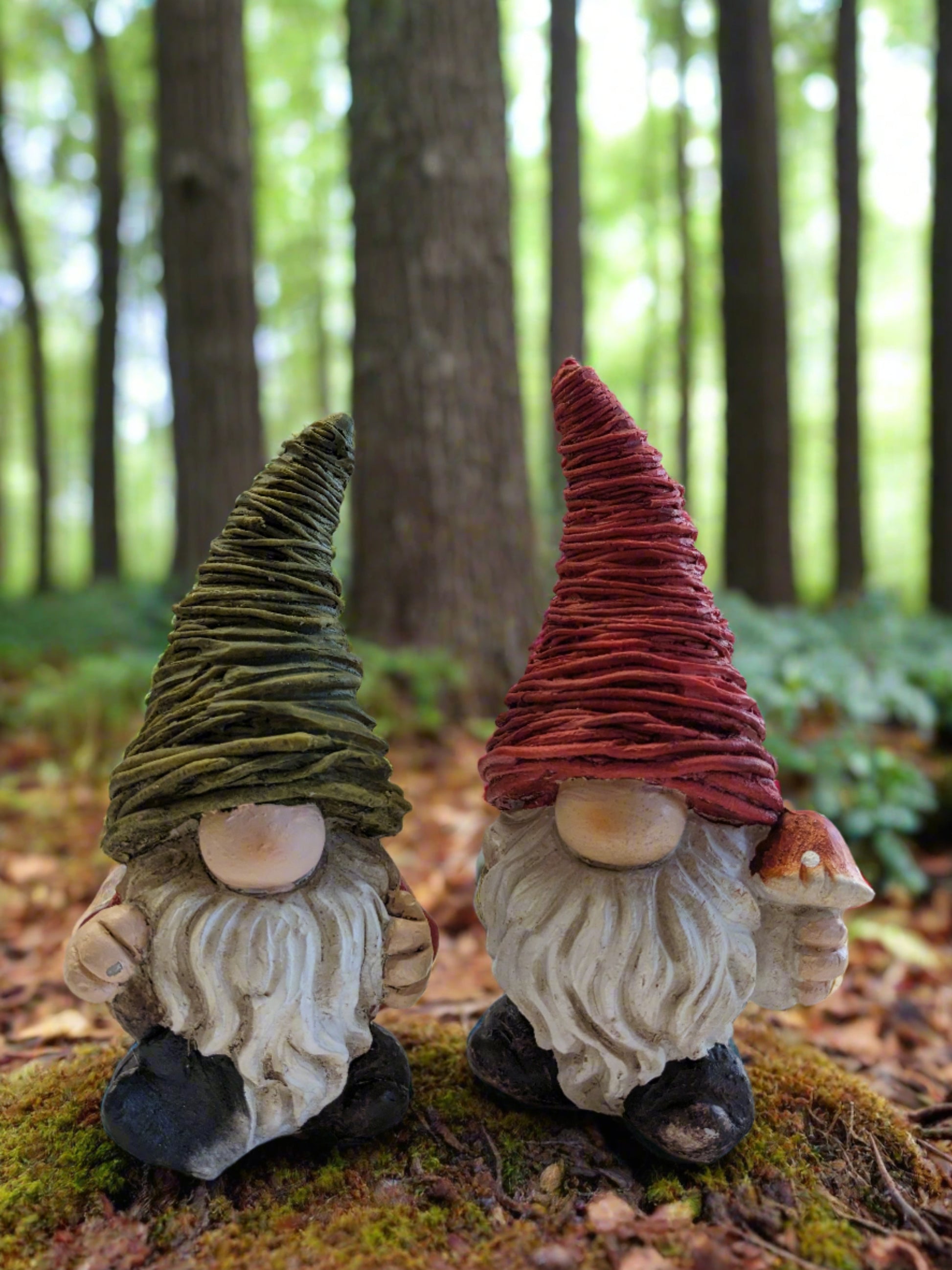 Choose from two gnomes: one wearing a red hat and holding a fly agaric mushroom, or wearing a green hat and holding a shovel. Both measure 6.5" tall and 3.25" wide. Listing is for one figure.