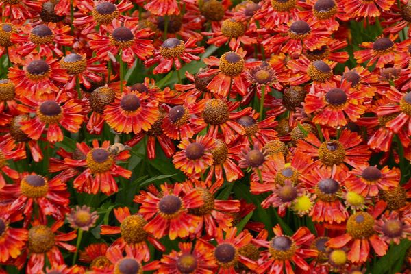 A unique development in helenium, 'Salsa' produces one of the brightest red colors available. Compact and upright in habit, it is completely loaded with blooms in fiery vibrant colors of red, orange, and gold mid to late summer. Strong stems hold the flowers up above the foliage which can be cut back after the flowers fade to encourage a second flush of blooms. Spice up your summer perennial garden with this lively variety.