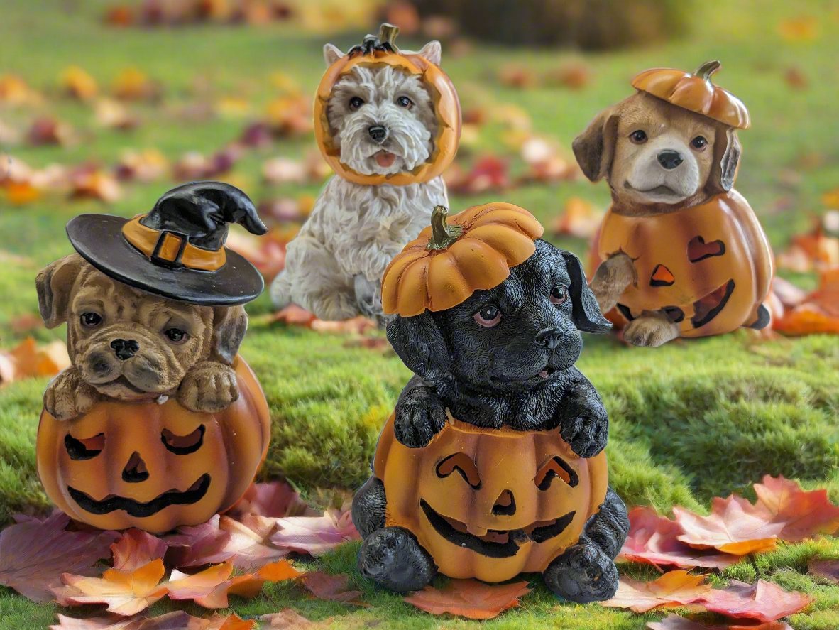 Resin LED Pumpkin And Dog Tabletop Decor, 4 assorted. Batteries included.