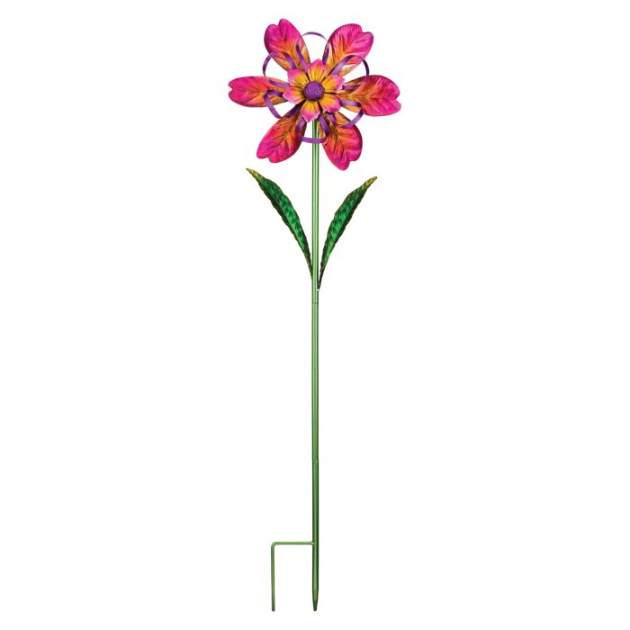 This 10" flower spinner stake is painted with bright, iridescent colors. Flower and ribbons spin in a slight wind thanks to a ball bearing inside.