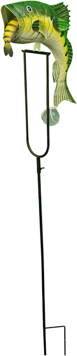 Have fun with this bass fish kinetic rocker garden stake. Fish rocks back and forth in the wind. Includes 2 prong stake.