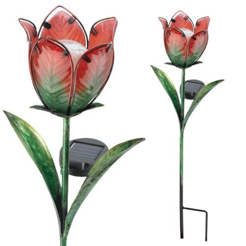 Brightly colored and delightfully detailed, this glass garden stake features a solar panel that collects sunlight during the day and illuminates the garden at night.