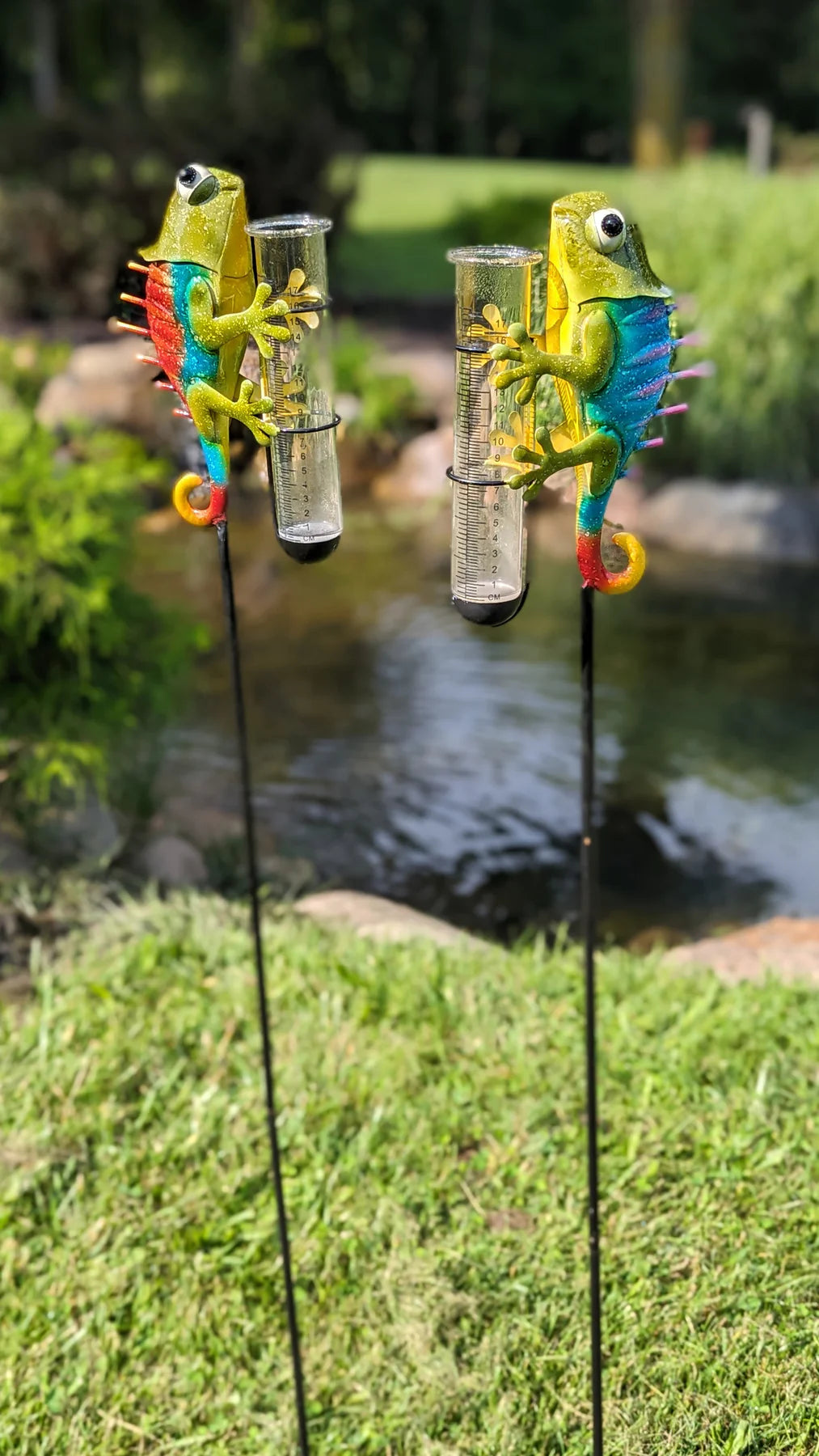 - These cute chameleon rain gauges add a wild yet practical touch to your garden! The glass tubes can measure up to 7 inches of rain.