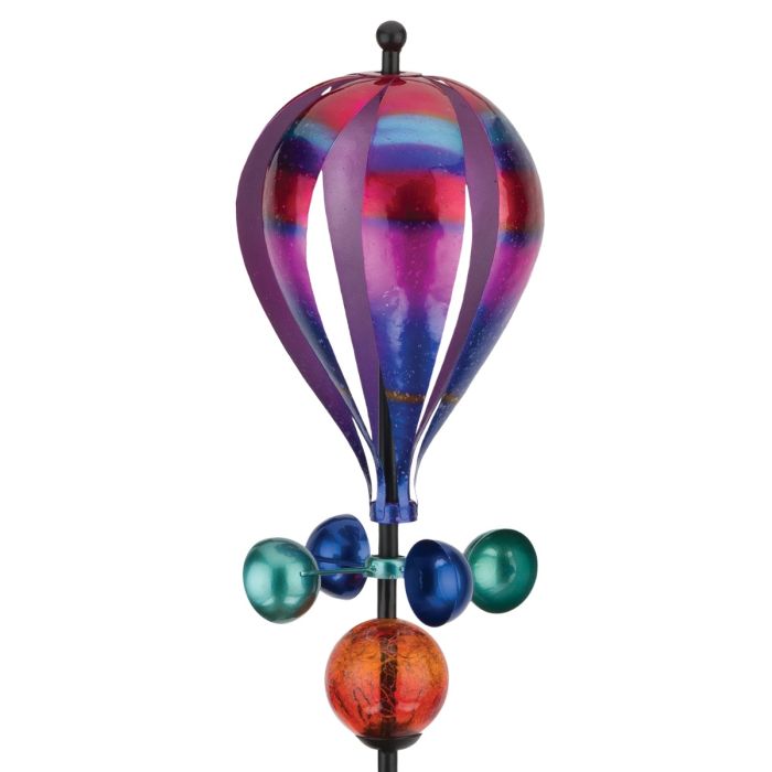 These colorful Balloon Solar Wind Spinner Stakes seemingly fly through the air when the breeze hits them. The multi-colored balloon spins one way while the 4 cup spinner below it spins the other. At night a string of LED lights illuminate the colored crackle ball.
